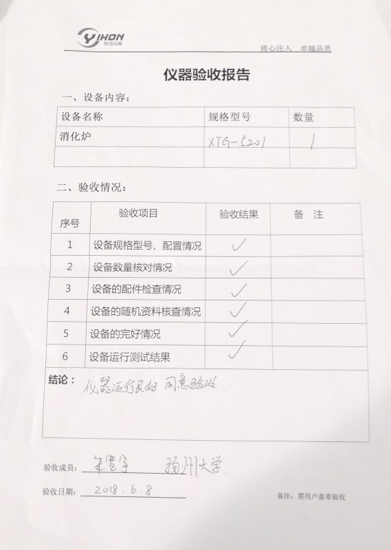 揚州大學近期采購消化爐XTG-5201一臺,祎鴻已于6月完成產品驗收。XTG-5201紅外消解儀采用電熱絲復合真空加熱技術,升溫效率高,溫度均勻性好,可為揚州大學相關專業對種子、土壤、植株、飼料、礦石等化學分析之前的樣品進行消解處理。