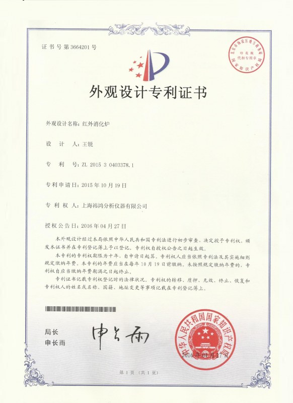 在始終堅持技術創新、打造卓越品質的經營理念為指導思想帶動下,上海祎鴻分析儀器有限公司技術團隊經過不懈地努力,已經有多項專利申請獲得國家知識產權局受理。在此,向工作在技術一線的全體工程師們表示敬意,特別要感謝上海祎鴻技術領頭人王銳、李兵在國內定氮儀、消化爐的技術創新過程中所付出的辛勤勞動!我們有理由相信,在未來的中國定氮儀和消化爐高端檢測儀器市場上,上海祎鴻的技術團隊獎做出更大的貢獻!