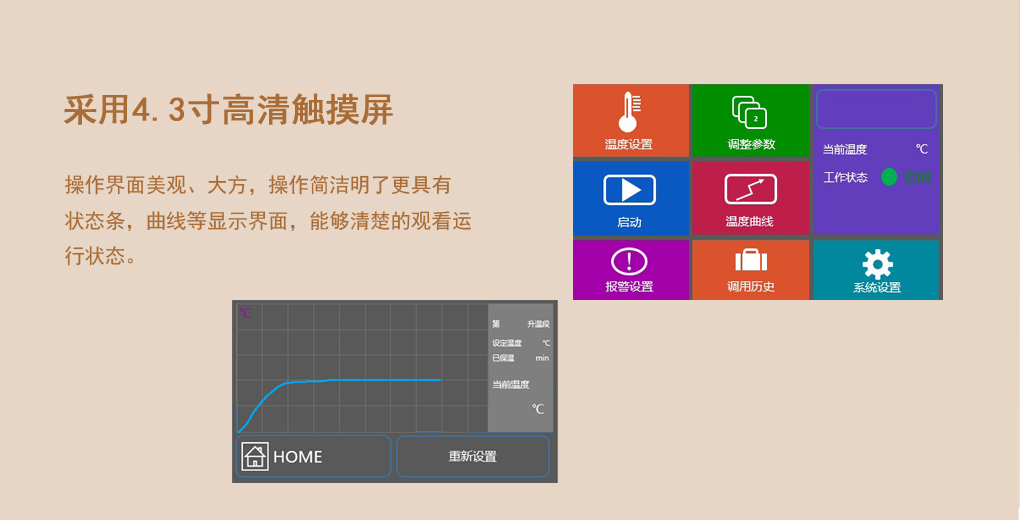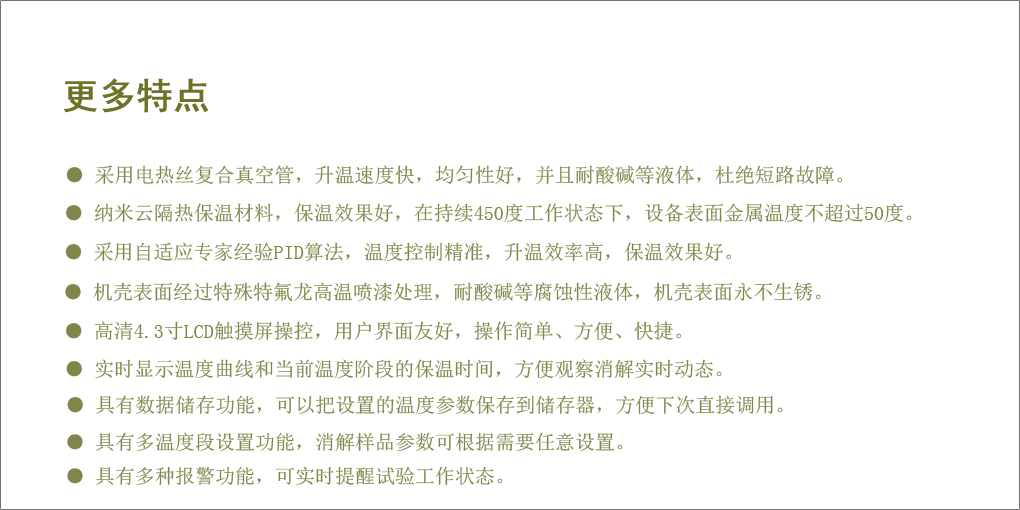采用電熱絲復合真空加熱技術(shù),升溫效率高,溫度均勻性好。采用行業(yè)領(lǐng)先的納米云隔熱材料,熱效率高,節(jié)能環(huán)保。更具有4.3寸高清LCD觸摸屏操控界面,簡單易懂,并具實時顯示溫度曲線功能,摒棄了以往溫控表頭繁瑣的操作。 XTG5000真空電熱絲適用于食品、醫(yī)療、農(nóng)業(yè)、林業(yè)、生化等行業(yè)以及高等院校、科研部門對種子、土壤、植株、飼料、礦石等化學分析之前的樣品消解處理 |